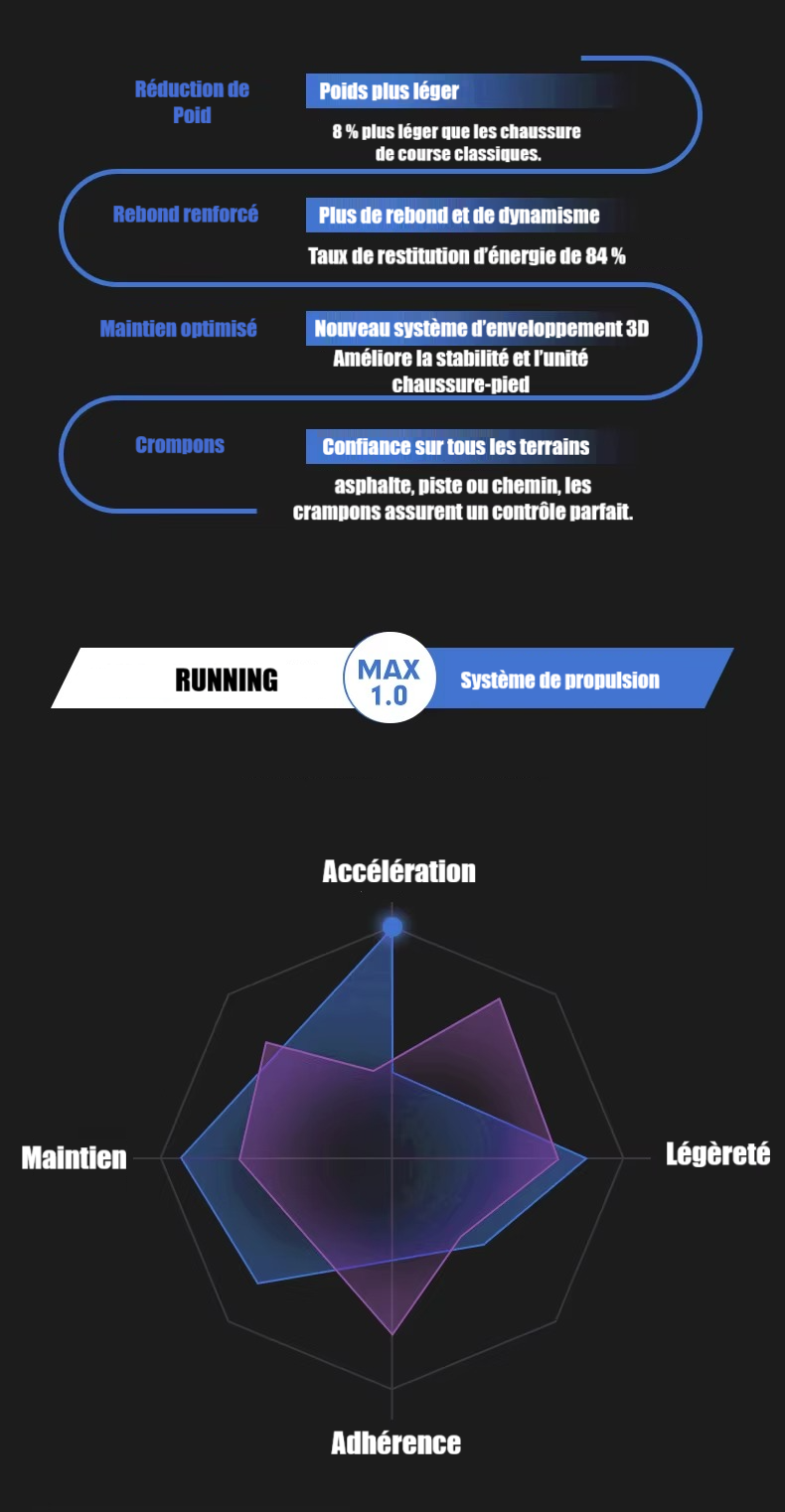 Amorti supérieur : absorbe les chocs et protège vos articulations lors de la course, du fitness ou de la marche.