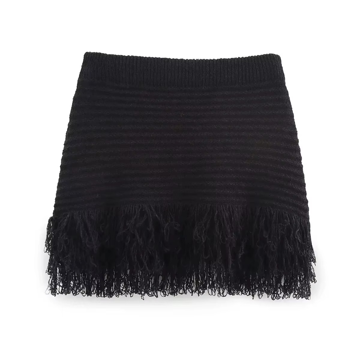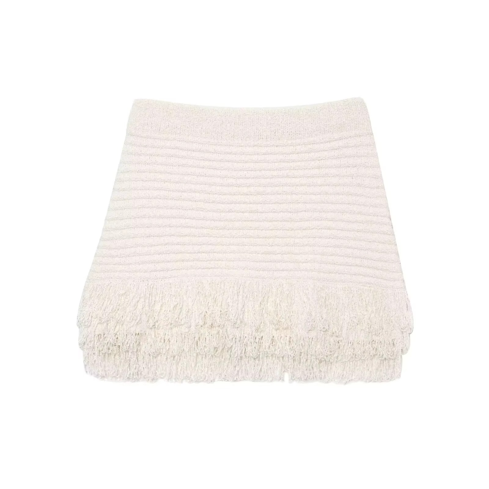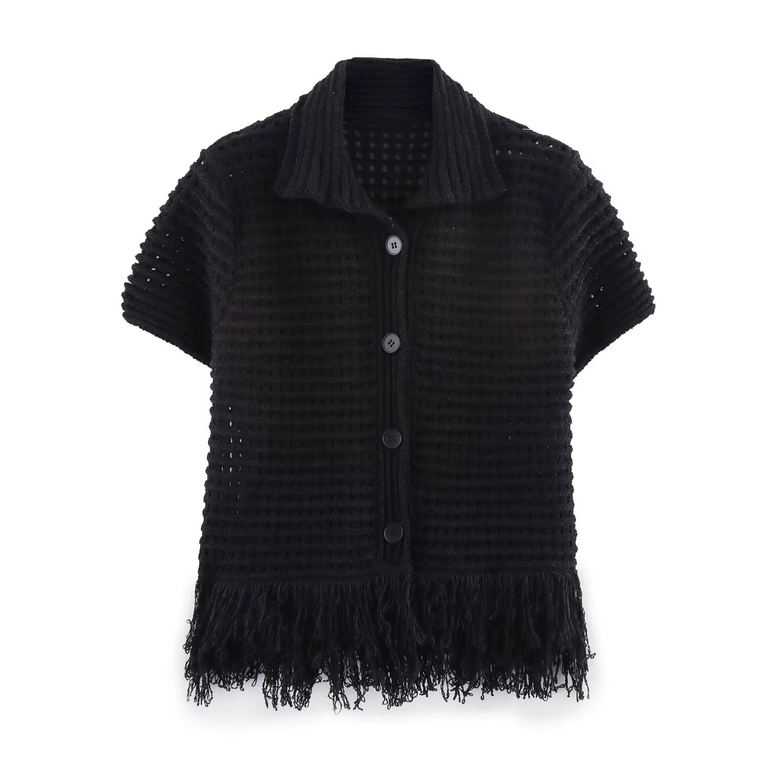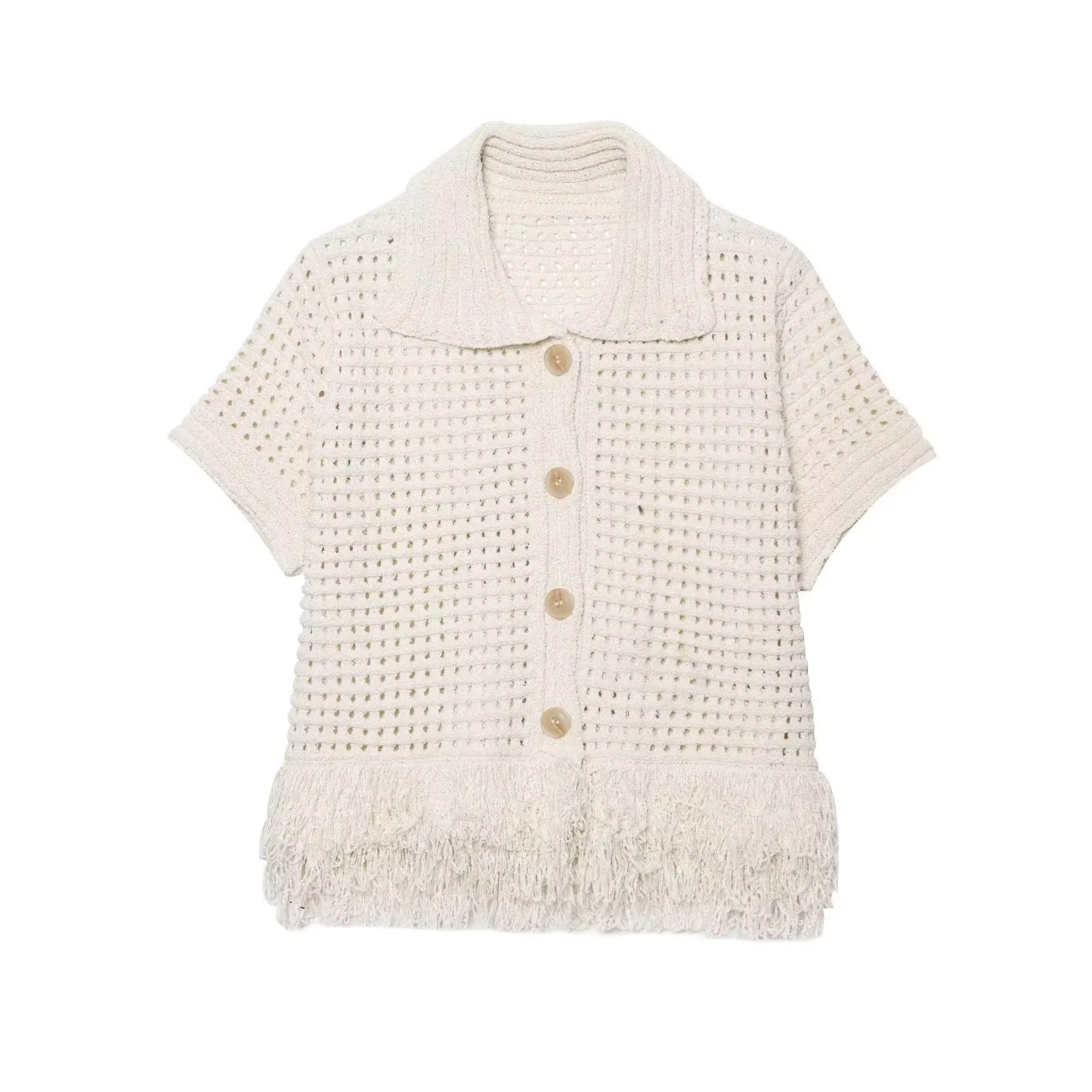 La veste courte à manches courtes séduit par son tissage texturé et ses boutons en bois et coton qui apportent une touche artisanale et naturelle. Associée à la jupe taille haute à franges, l’ensemble crée une silhouette à la fois moderne et féminine, jouant sur le charme du style bohème et l’élégance casual.