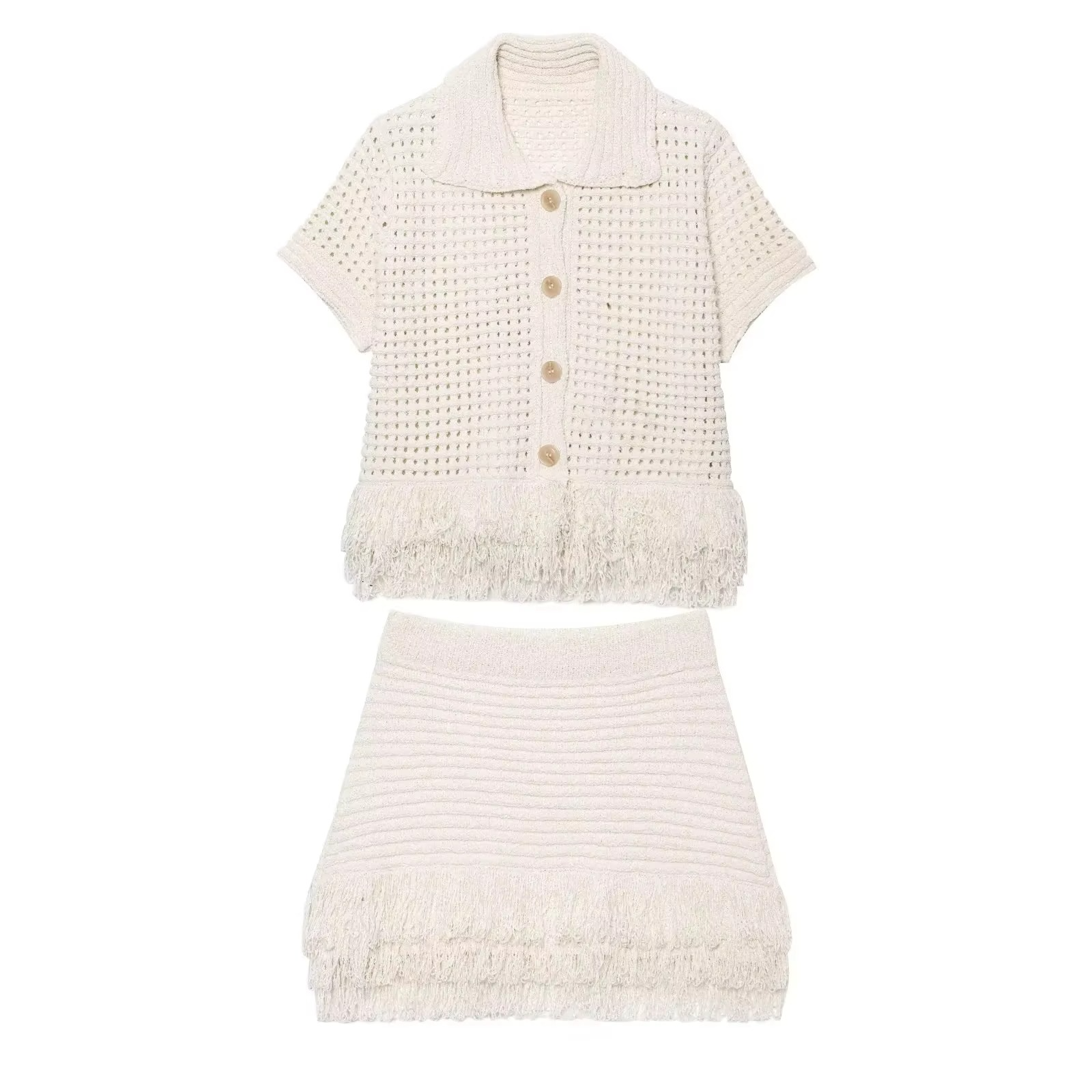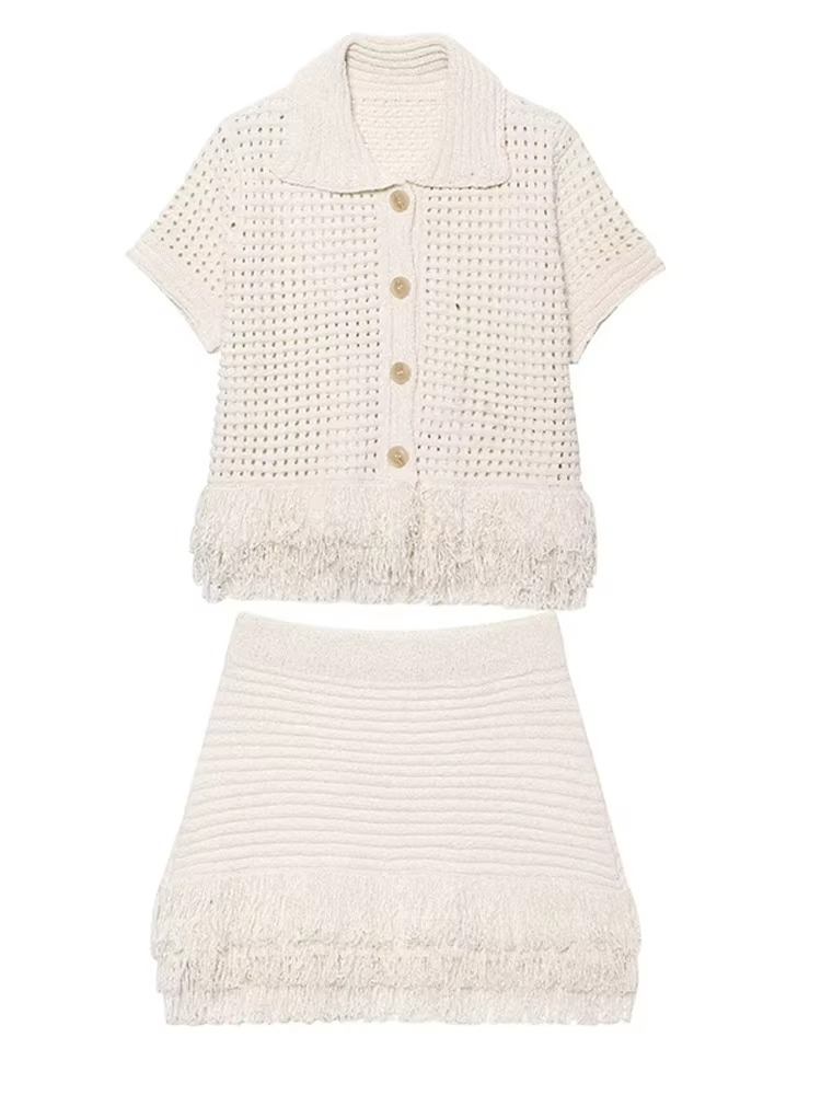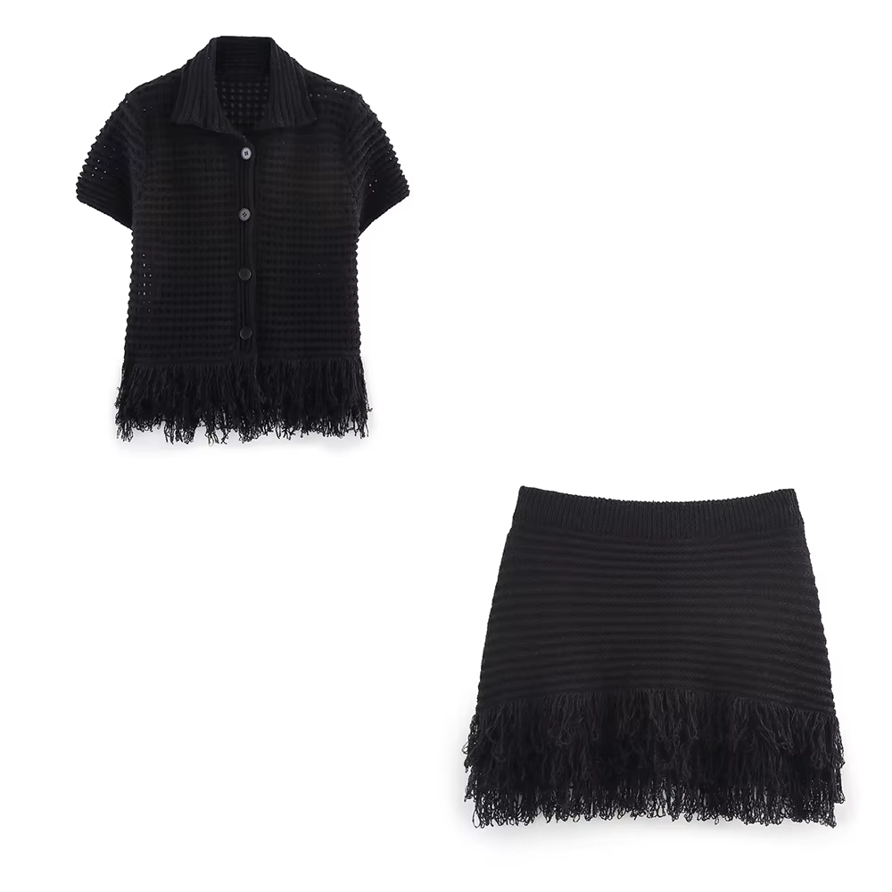 👗 Design 2 pièces : haut à col polo avec boutons + jupe mini avec finitions à franges.